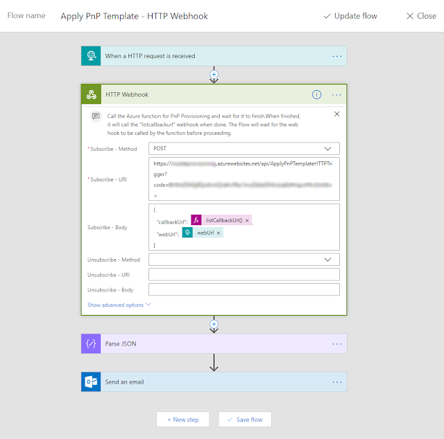 Fortunately, there is a nice way to handle this. Using the HTTP Webhook action, we can basically wait for the provisioning to complete before returning the control back to the Flow. Since we are in a serverless world here, the Flow will essentially pause here and "wake up" when we want it to.To use this approach, we have to make a slight modification to the approach suggested in the Microsoft documentation. In this approach, instead of firing the Azure Function with a queue trigger, we will fire it using the HTTP Webhook action. The Function will be configured to execute on HTTP trigger i.e. when an HTTP request is made to an endpoint.