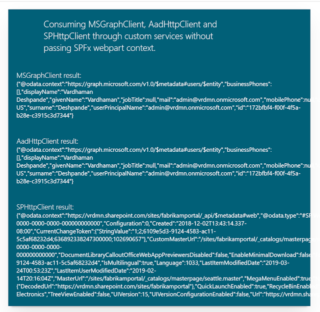 If you observe the code, our calling webpart does not have any knowledge of the implementation details of the custom service, specifically the fact that it used the MSGraphClient internally to retrieve the current user details. In the future, if we wanted to change the implementation of the service, we could do it without changing any web part code.